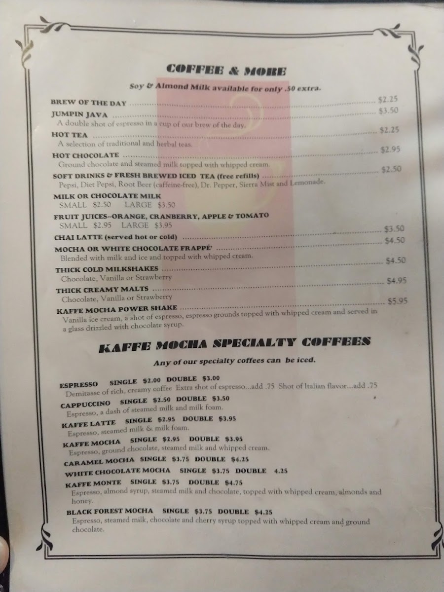 As you enjoy your meal, sip on their specialty drinks like the creamy mocha or white chocolate frappe or a refreshing Kaffe Mocha Power Shake. Each sip is designed to please, turning any ordinary meal into a delightful experience.